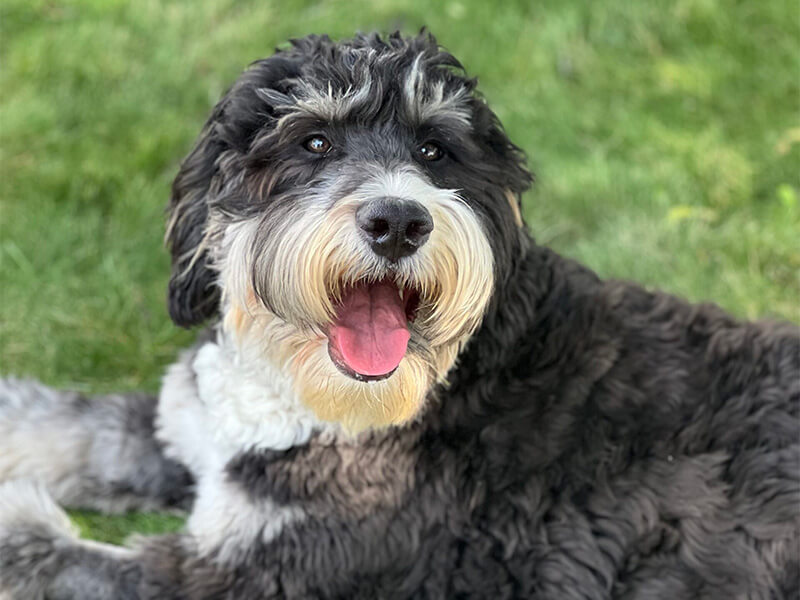 Bernadoodle Spudnick, born 10/15/2024. is an altered female who weighs 58 pounds. Spudnick can be a little shy to start, but warms up pretty quickly. Shen enjoys her grooming time and loves to play with other dogs. She does great with people, kids, and cats. She will play fetch. Her recall and down are awesome.
