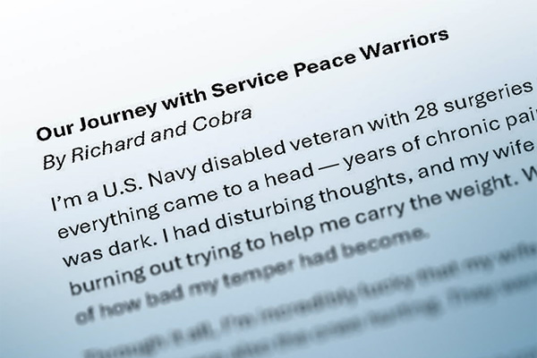 Our Journey with Service Peace Warriors By Richard and Cobra I’m a U.S. Navy disabled veteran with 28 surgeries or